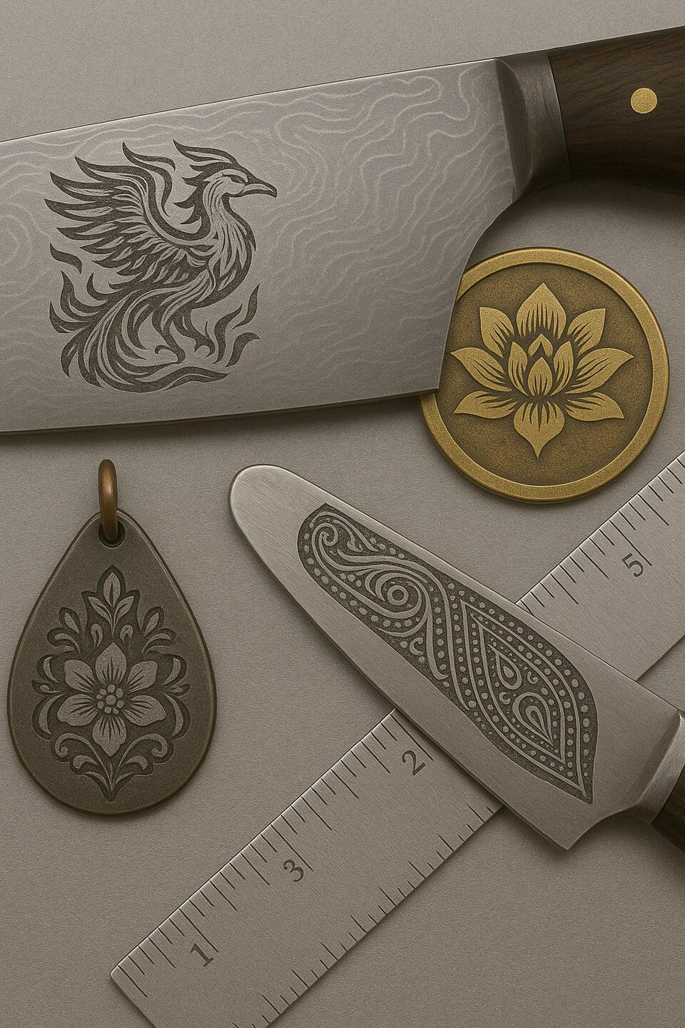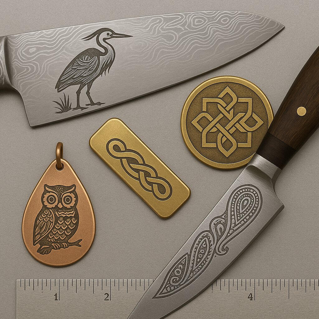 Personalize your blades, tools, and gear with permanent, professional-grade markings. Whether it's your initials, a logo, a design, or artwork, our electro etching process delivers crisp, clean results on all types of steel and other conductive metals.Every piece is etched by hand for quality and attention to detail. no cheap stickers or engraving machines.Custom Knife Making